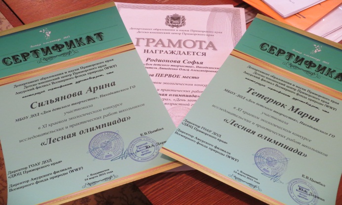 Грамоту Департамента образования и науки Приморского края и детско- юношеского центра Приморского края и футболку с логотипом Амурского тигра вручили Родионовой Софьи за участие в краевом конкурсе. Награждение состоялось в городе Владивостоке.